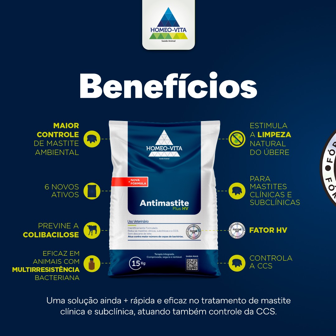 O ANTIMASTITE PLUS HV conta com as cepas de bactérias do Antimastite + Leite (streptococcinum, staphylococcus áureos mais ativos homeopaticos) e mais seis novos ativos (escherichia coli, klebisiella pneumoniae, pseudomonas aeruginosa, streptococcus agalactiae, streptococcus uberis, pyrogenium) totalizando 16 ativos, além do pool de bactérias. Maior controle de mastite clínica, subclínica e ambiental. Eficaz em animais com multirresistência bacteriana. Estimula a limpeza natural do úbere. Previne a colibacilose e por fim controla a CCS.